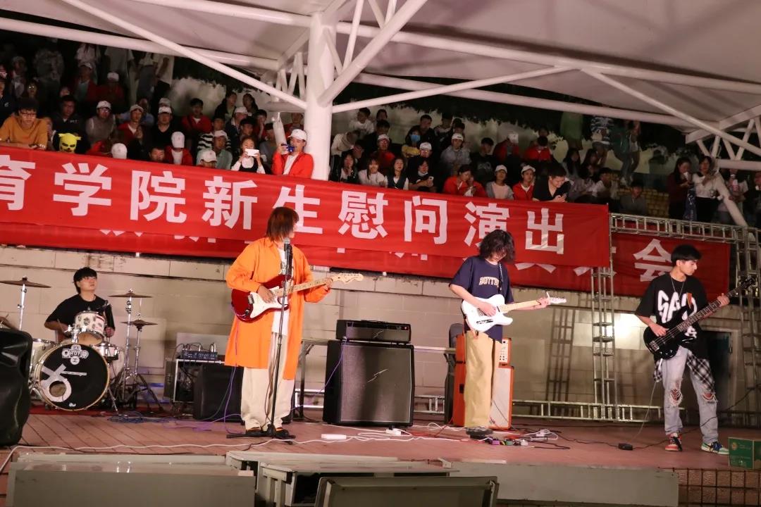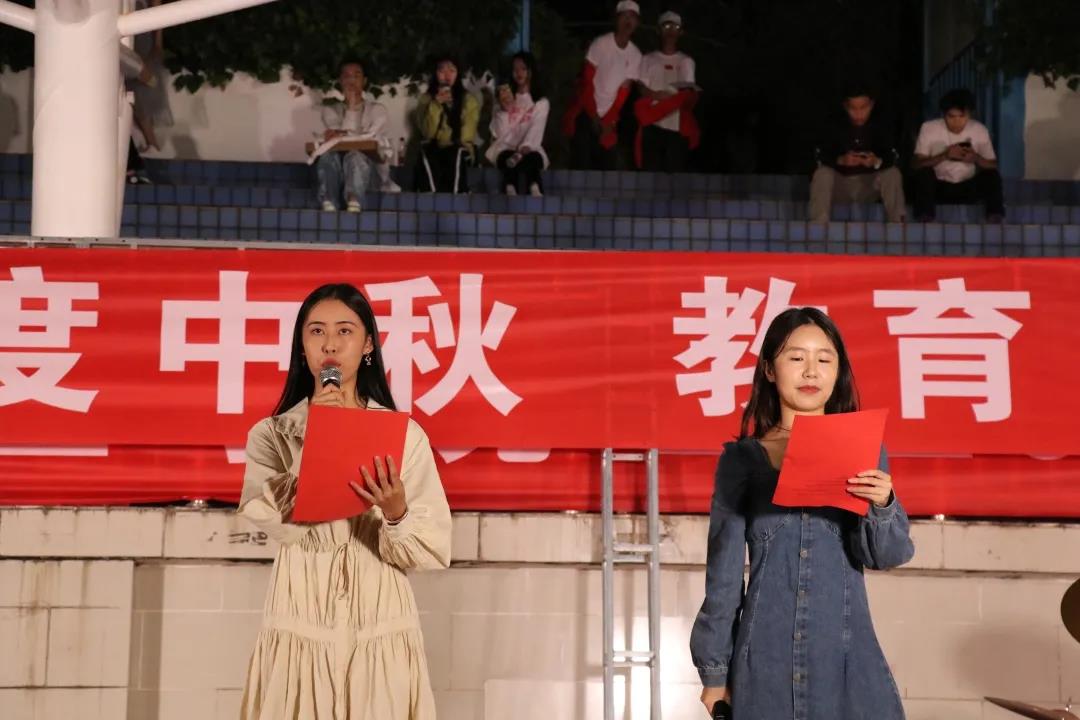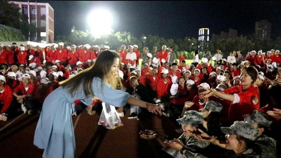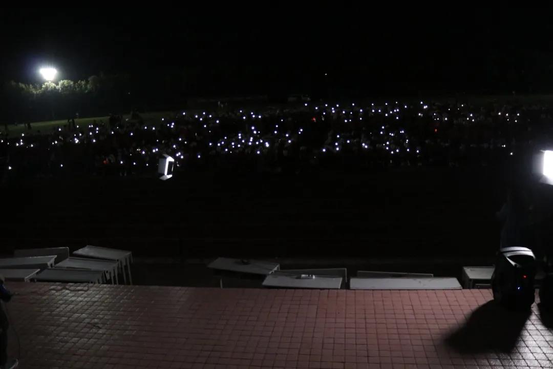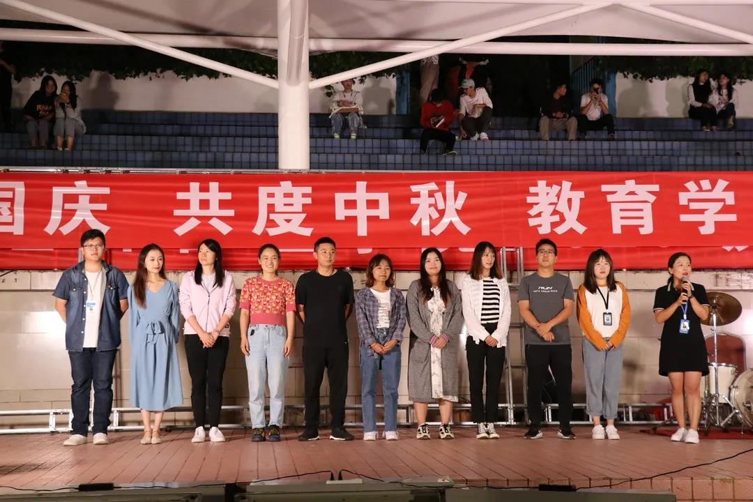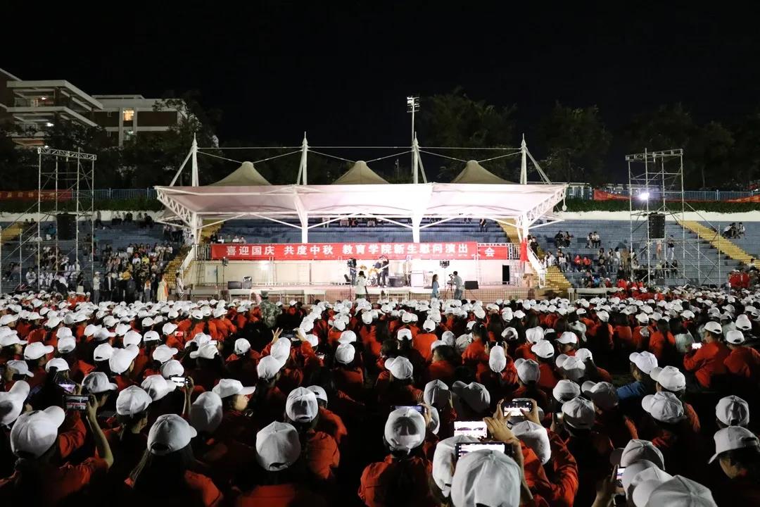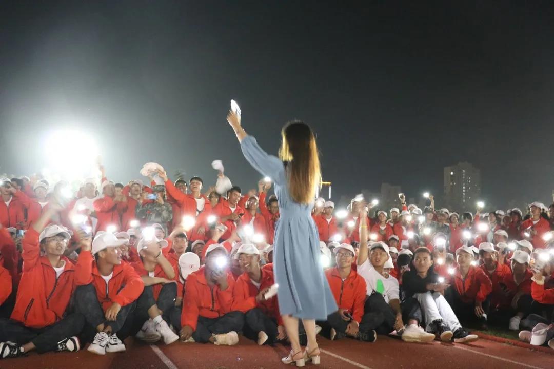 教育学院大一新生汇聚足球场,教育学院党总支副书记杨淑雯老师、校团委社团工作部部长赵应心老师、校团委副书记李杨老师亲临现场表示慰问,还有陪伴同学们军训的团委书记王婷瑾老师、新生各班辅导员到达现场,露天的足球场瞬间热闹起来,主持人清脆的声音响起,今天的晚会也随之而来。