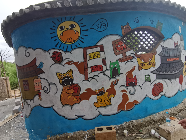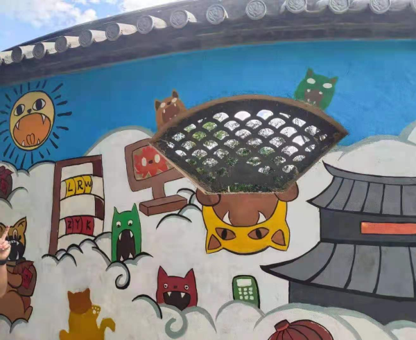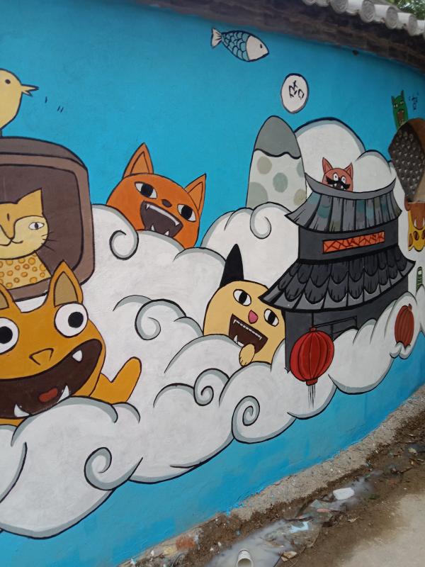 今天的主要任务是将石江村金艺巷绘制的壁画墙进行细节深入,将壁画作品局部修改,使画面更加丰富,生动形象;将瓦猫的身子加上三角形,花纹,圆形等图形,将总体画面加亮,将对比度加强,使明、暗、灰的关系总体表现到位,将房子瓦片的质感细化,给局部加上阴影和投影,使细节丰富而耐看。