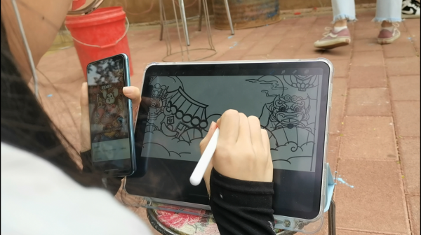 画面整体风格定为国潮风,融入石江村瓦猫元素作为主体物。由学生设计出完整画面线稿,分小组合作,共同完成线稿勾画、铺色、局部细节调整等环节,并在实际绘画中不断与设计方案的同学沟通改进,使得画面更加丰富饱满,局部细节完善,效果更突出。