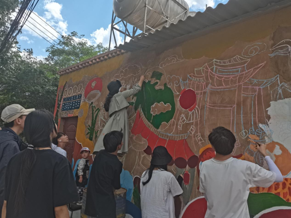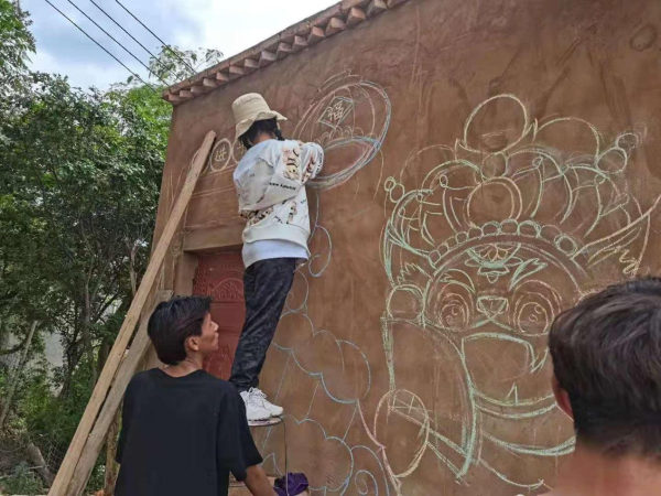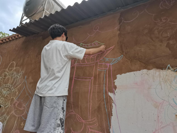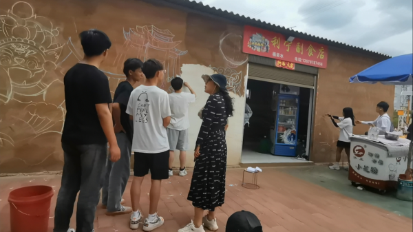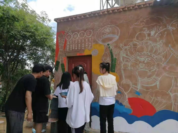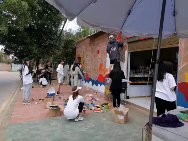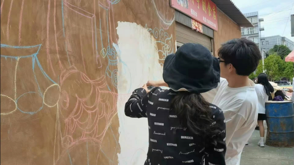 余梦瑶老师和农伟院长在现场进行指导、勘察,为学生实践、方案设计提出了宝贵意见,余梦瑶老师还为学生讲解墙绘绘画技巧与笔法应用并亲自示范,同学们受益匪浅,有了很大的进步。