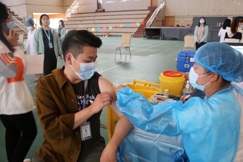 4月16日13:30,学生以班级为单位,分时段、分批次有序进入现场接种疫苗。体育馆内按照接种流程划分为等候区、测温区、健康咨询区、登记区、接种区、留观区,严格落实“一人一苗一码”,实现接种信息全程可追溯。疫苗接种现场,由团委学生会、党员活动中心、国防后备营组成的志愿者队伍负责维持秩序、为前来接种的人员提示接种流程步骤和注意事项的解答。志愿者按照人员分组,负责温度测量、血压测量、知情同意书领取与填写、身份证信息核对与录入、医务问询、疫苗接种等各个环节。接种完成后,同学们按照引导在留观区留观30分钟。面对接种人员的疑惑,医务人员们悉心聆听、认真解答,整个现场井然有序。