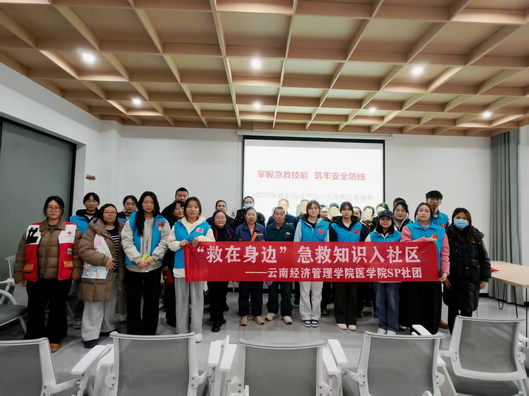 - 2025年11月,为进一步提升社区居民与高校学生的应急救护能力,增强公众安全意识,由学校引导、云南经济管理学院医学院SP社团发起,学生会社会实践部协助组织的“救在身边”急救知识入社区系列活动,于11月21日在县街街道宁泊社区成功开展应急救护培训。开展“救在身边”急救知识科普活动,通过理论讲解与实操演练相结合的方式,为社区居民送上实用急救技能。 本次活动以“掌握急救技能,筑牢安全防线”为主题,旨在通过专业讲解与实操演练相结合的方式,普及心肺复苏、创伤包扎、常见急症处理等基础急救知识,提升居民在突发