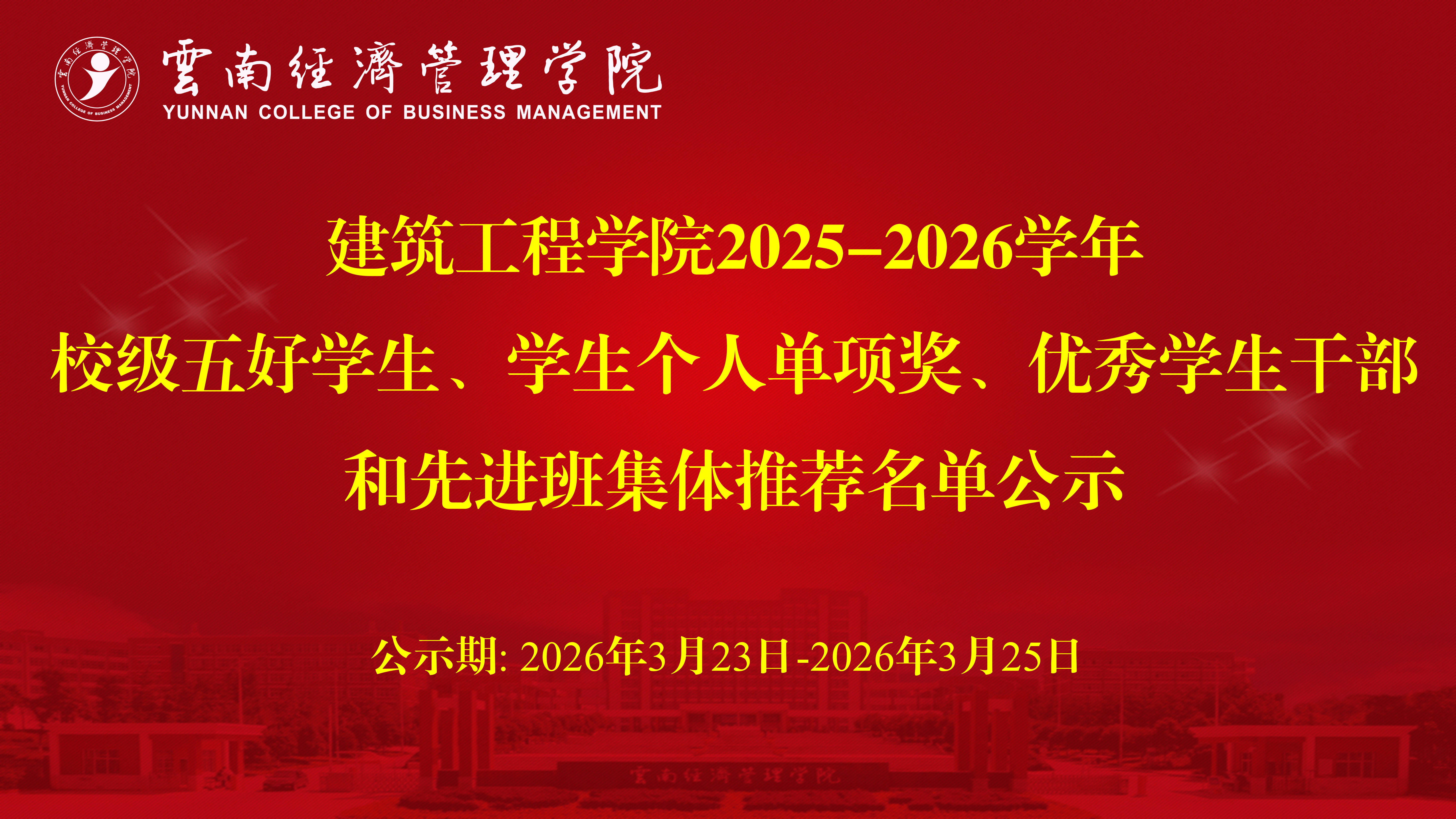 - 根据《关于开展2025-2026学年五好学生 优秀学生干部 学生个人单项奖及先进班集体评选工作的通知》(云经管院党学发〔2026〕4号)要求,建筑工程学院通过班级推荐、学生自荐、班主任和辅导员资格审核、班级全体学生民主评议的方式,确定符东梅、于沾溢等5名省级优秀五好学生,施江月1名省级优秀学生干部,22本科造价、23本科建筑学等3个省级先进班集体。经建筑工程学院党政联席会审议,现将名单予以公示。公示期自2026年3月23日起至2026年3月25日止。如有异议,请在公示期内以书面或邮件形式向学院反