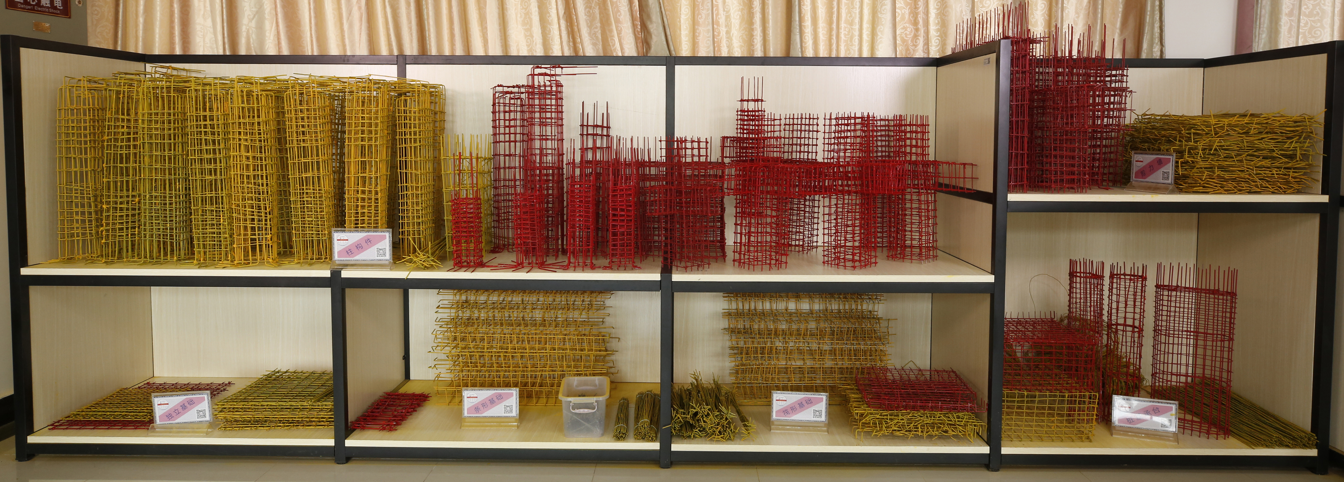 线下用相关材料和工具,根据国家建筑标准设计图集和结构施工图,按比例制作了进100种不同的钢筋模型,合计406个,建成钢筋模型实训室1个。